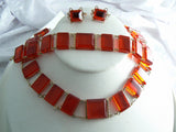Vintage Lucite Panel Necklace Bracelet & Earring Set. Gold filled with bright red clear lucite panels. The necklace measures 15", the bracelet is 6 3/4" and the earrings are 3/4" Very good condition with some minor surface scratches.