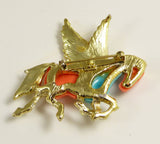 Vintage Hattie Carnegie Thermoset Lucite Rhinestone Pegasus Brooch. Coral and turquoise thermoset Lucite with rhinestone accents Pegasus brooch with rhinestone accents. Set in gold tone metal. This piece is unsigned, as many of her pieces were. This is one of her more well known and verified pieces. Measures approx 2 1/4" long by 1 7/8" wide. Excellent vintage condition.