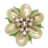 Vintage High End Faux Pearl Art Glass Rhinestone Flower Brooch. The brooch features art glass leaves, faux pearl petals, and bi color rhinestones. It is of excellent quality and measures approx 2 3/8” in diameter. One of the glass leaves is cracked though it remains intact as there is a wire running through it. Overall excellent condition. circa 1960's.