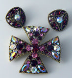 Red, pink and AB rhinestone Maltese Demi Parure set in gold tone metal. The earrings are signed Hollycraft.The brooch measures 2" in diameter and the clip earrings measure 1" long and 7/8" wide. Excellent vintage condition.
