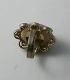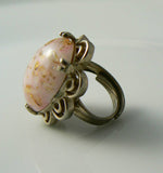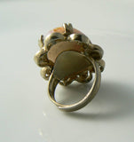 Ring made by Hollycraft. It is made of a beautiful huge oval pink cabochon. The large oval cabochon is pronged set. Set in antiqued gold tone filigree metal. Signed HOLLYCRAFT. The Ring measures 1.05" wide by 1.25" long. The shank is adjustable to fit any finger. Excellent condition.
