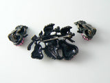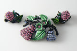 Vintage Hollycraft pink, blue and green rhinestone enamel demi parure. Pink and blue round cut rhinestones with green and black enameling make up this cluster of berries and leaves. The brooch is signed Hollycraft, the earrings are unsigned. Measures 1 3/4" and the earrings are 1". Excellent condition.