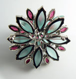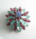 Vintage Huge Plastic Rhinestone Domed Christmas Tree Rhinestone Brooch. This piece is unique for its full size and design. Looking at the top of the piece it reminds me of a Christmas tree in its design. The pink and pastel blue cabochons are plastic and the top of the "tree" has glass rhinestones. The brooch has four tiers and is a full 1.5" thick. Excellent condition. Measures over 2 1/2" in diameter.
