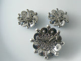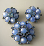 Vintage Judy Lee Signed Light Blue brooch and earrings. This has light blue colored round rhinestones with light blue moonstone cut rhinestones set in silver tone metal. Signed Judy Lee on all pieces. The brooch measures 2" in diameter and the clip earrings measure 1 1/2". This set is in excellent condition.