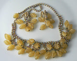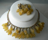 Vintage Juliana AB Rhinestone and Drippy Glass Bead Necklace and Earrings Set. AB round cut rhinestones with yellow twisted glass beads set in gold tone. Earrings are clip. Measures 16 1/2" and the earrings measure 1 3/4". Excellent condition. circa 1960's.