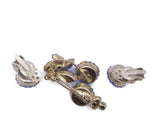 Vintage Juliana Baby Blue Margarita Rhinestone Flower Demi Parure. Set in silver tone metal. This lovely DeLizza & Elster set is accented with baby blue rhinestones and emerald green rhinestones. The brooch measures 1 3/4" and the clip earrings measure 3/4". Very good vintage condition. circa 1960's.