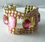 Vintage Juliana wide pink rhinestone bracelet set in gold tone metal.. Fabulous tear drop cut rhinestones with pink pastel emerald and round cut rhinestones. Measures 7" long and 1 1/2" wide. Excellent condition