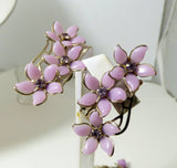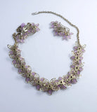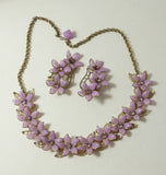 Vintage Lavender Rhinestone Plastic Flower Book Chain Necklace and Clip Earrings