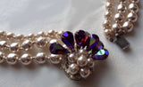 Vintage Miriam Haskell 3 Strand Baroque Pearl Rhinestone Clasp Necklace. The clasp has dark reddish purple tear drop rhinestones with glass pearls. Set in silver tone metal. Signed Miriam Haskell on the clasp. Measures 19" in length including clasp. The pearls measure 7-8mm. Excellent near mint condition.