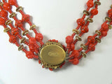Vintage Miriam Haskell 4 Strand Red and Gold Glass Bead Necklace.This has molded red and gold glass beads with a fabulous molded glass bead Floral Clasp. Set in gold tone metal, Signed Miriam Haskell. Measures 18" in length including clasp on the shortest strand. Excellent condition.