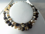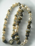 Amazing Vintage Miriam Haskell baroque glass pearl and filigree brass rhinestone bead necklace. Ivory Cream and gray baroque pearls, ribbed brass beads and filigree beads with alternating crystal and pink aurora borealis rhinestones. The Filigree rhinestone beads measure16.5 mm. The length of the necklace is 26" Signed Miriam Haskell on clasp. Very good condition with the exception, one of the tiny pearls on the clasp was replaced and the metal beads closest to the clasp have a couple of the prongs broken off which is hardly noticeable.