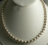 Vintage Miriam Haskell Signed Baroque Glass Pearl Necklace. Signed on clasp and hang tag. Set in gold tone metal. Measures 23" in length including clasp. The pearls are 7-8 mm. This is in outstanding condition.