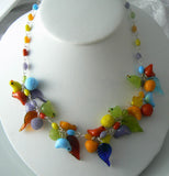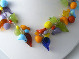 Necklace consisting of glass birds, glass leaves and glass textured "fruit" round beads. This necklace has a screw clasp fastening. Each glass bird measures approx. 17mm long. Each textured "fruit" bead measures approx. 11mm across. Excellent condition. Measures 18" in length.