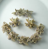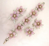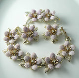 Vintage Pale Mauve Spring Flower Parure, bracelet, brooch and earrings Plastic flower with rhinestone centers set in gold tone metal. The bracelet measures 7 1/4" and has a fold over clasp. The brooch measures 2 3/4" in diameter. The clip earrings measure 1 1/4' in diameter. Excellent condition.