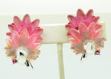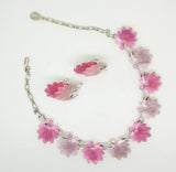 Vintage Pink Carved Lucite Rhinestone Necklace and Clip Earrings. Set in silver tone metal. This has pink rhinestones accenting the 2 shades of pink Lucite. The necklace measures 15" in length by 1" wide. The clip earrings are 1 1/2" long by 1" wide. Very good vintage condition. circa 1960's.