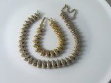 Vintage retro mid century modern pink demi parure consisting of a pink glass prong set necklace & matching bracelet. The stones are soft pink glass. The bracelet is 7" and the necklace is 15 1/2" Excellent vintage condition.