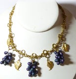 Purple Grape Cluster Gold Tone Fancy Chain Necklace.This has 3 grape clusters with 4 gold tone leaves. Secure shepherds hook clasp. The chain measures 14" in length. Each cluster is a little over an 1" Very good vintage condition.