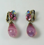 Vintage Regency Pink Art Glass Dangle Clip Earrings. Set in an antique gold finish. These have 2 marquise cut rhinestones and a large round faceted AB stone with a tear drop shaped art glass. They are unsigned Regency. These clip earrings measure 1 1/2" and are in very good condition.