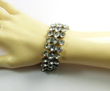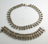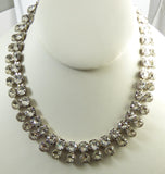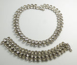 Vintage Rhinestone Necklace Bracelet Set. This is packed with row after row of clear round cut faceted glass rhinestones. Set in silver tone. Both the bracelet and necklace clasp are adorned with a crystal clear baguette. Both have a safety chain and secure fold over clasp. The necklace/choker measures 14" by 1/2"/ The bracelet is 6 1/2" by 3/4". No missing or dead stones, all bright and sparkly.