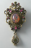 Vintage Sarah Coventry "Contessa" rhinestone brooch/pendant set in antiqued gold. The brooch has a beautiful opal-like center glass stone. The brooch is in good condition and shows only light previous wear. Signed SARAH COV. Measures 3" from top to the bottom of the dangle and 1 3/4" at the widest point.