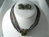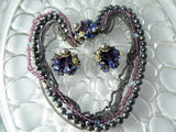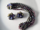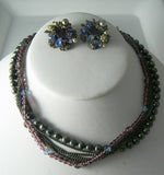 Vintage beautiful signed Eugene necklace that has a strand of grey pearls a strand of purple and blue crystals and four silver tone chains. It has a fancy clasp with glass pearls and silver tone leaves. The necklace is 16" long and the clasp is 1" round. The matching clip earrings are 1 1/4"