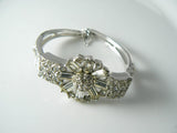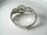 Vintage signed Ledo rhinestone baguette clamper bracelet set in silver tone metal. Signed Ledo. Measures 6" around inside, 1 7/8" across the top and 1" tall at the front. It will open enough to fit most wrists. and has a safety chain. All stones are clear and present. A few have started to yellow and some wear to the metal.