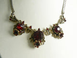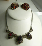 Vintage Signed Schreiner of NY Earrings with Necklace. This is a stunning pair of Schreiner of NY garnet colored rhinestone earrings, paired with an unsigned beauty of a necklace. The necklace has three large garnet colored chaton rhinestones as focal points. Each of them is set to resemble a flower opening, with the petals unfolding to lay flat. Going further up the sides of the necklace, the motif is continued by leaves adorned with more garnet rhinestones. The necklace measures 16 1/2" by 1 1/4", with a J hook closure.