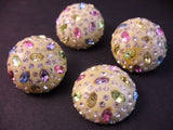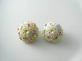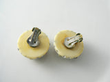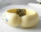 Vintage Weiss Creme Colored Celluloid Clamper and earrings set. Both the earrings and bracelet are signed Weiss. This comes with an extra set of earrings as shown in the last picture. They do not have backs but can be used to replace stones. No missing stones (except in the extra earring set) Very good vintage condition with the exception of some minor verdigris. Measures 2 1/4" inner diameter side to side and 2" front to back. The earrings are a little over 1" in diameter.