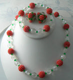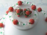 This is a fun set marked West Germany made up of clear lucite beads and red lucite raspberries. The metal is gold tone.