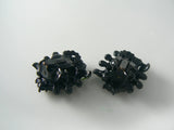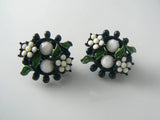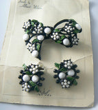 WEISS Japanned Black Metal Green Enamel White Bead Flowers Pin Set on Card. This beautiful vintage pin and clip earring set are still on their original Weiss card, but I don't think the pieces themselves are signed. They have black japanned metal with green enameled leaves and white rhinestone flowers. The pin is 2 1/4".