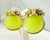 Beautiful Yellow Bead Enamel & Rhinestone Flowers Necklace Bracelet Earring Set. This vintage necklace, bracelet and clip earring are set in gold tone. It has yellow beads, yellow enameled flowers and sparkling ice rhinestones. All the discs are 1" in diameter. The bracelet measures 7 1/4" in length and the necklace is 17 1/2" long. Very good vintage condition with slight wear to the enamel on the flowers.