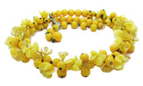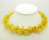 Yellow Glass Flower Beaded Necklace. 8mm yellow glass beads on wire. Large opaque yellow flowers and pale yellow translucent glass flowers. Measures 15" with a 4" beaded extension. Excellent vintage condition. circa 1940's.