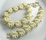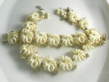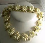 Yellow lucite flowers jonquil rhinestones necklace bracelet set in gold tone metal. The necklace measures 17 1/2" by 1 1/8" and the bracelet is 7 3/8" by 1 1/8". Very good condition.
