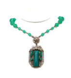 Vintage Chrysoprase Glass Czech Necklace Art Deco Rose Lariat. This has silver tone repousse rose motif. The beads are chrysoprase glass and measure from 5x7mm up to 12x14mm. The pendant measures 2 1/2" (63.5mm) long from the top of the rose and just shy of 1 1/4" (31.75mm) wide. Measures 21" (53.34cm) in length. It has a secure spring ring closure. The closing ring is stamped CZECHOSLAV. Very good condition, it does have a small repair to the bottom left of the pendant on the backside. circa 1930's.