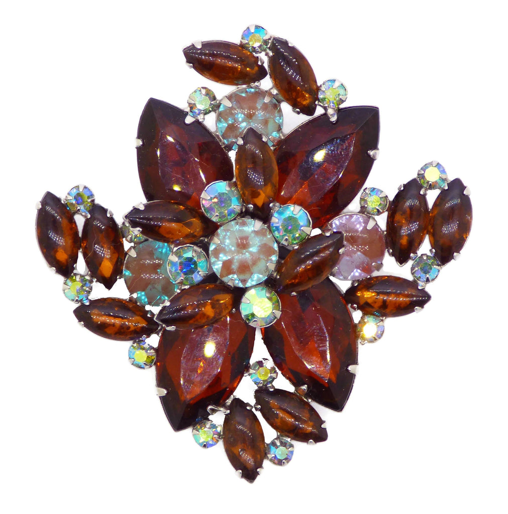 Vintage Garne Jewels Saphiret Rhinestone Brooch. This has large Cognac colored glass stones, AB rhinestones and 4 large saphiret stones The saphirets are 6 mm in diameter. Rhodium plated and signed Garne jewels. It measures 3" by 3" and is in excellent condition. High end heavy piece. circa 1960's.