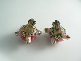 Alice Caviness Double Strand Pink Glass Necklace and Earring Set set in gold tone metal. Both pieces are signed Alice Caviness. The earrings also have acrylic flower accents. The necklace has good weight to it. It's 24" long and approximately .5" wide. The clip earrings are 1" long by 1.75" wide. Both in very good to excellent vintage condition with the clasp and clips in perfect working order. There is some very minor wear to the necklace clasp. circa 1950's.