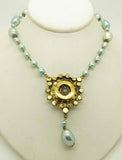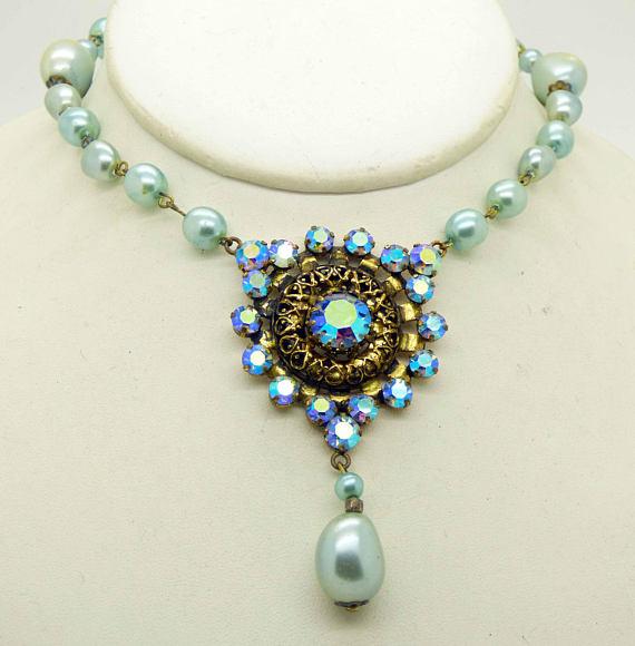 Vintage Baroque Pale Blue Glass Pearl AB Crystal Drop Pendant Necklace
