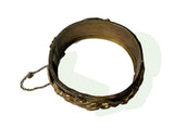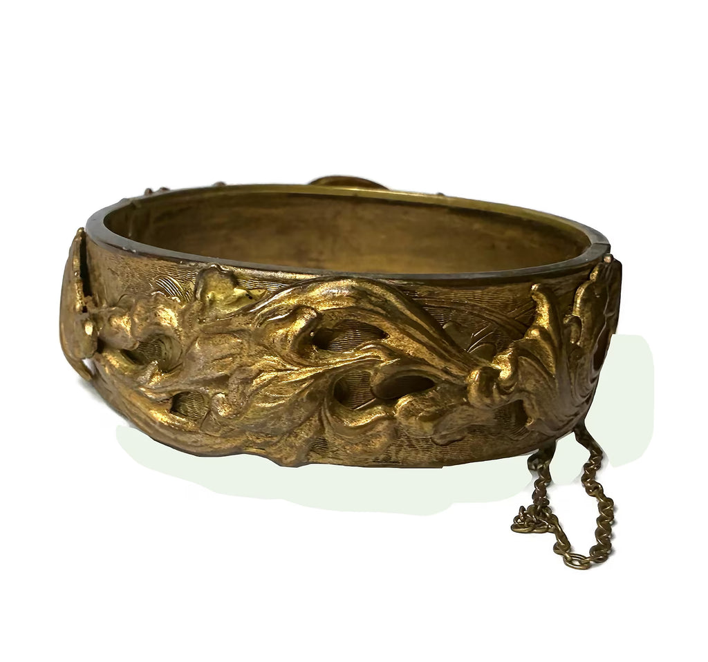 Victorian gilded brass hinged repoussé Bracelet. The bracelet is made of gilded brass and features a repoussé design with scrolls and leaves. It is a hinged cuff bracelet, meaning it opens to fit over the wrist and is secured with a clasp and a safety chain. Very good vintage bracelet.