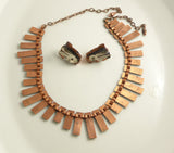 Matisse Renoir Blue Enamel Peter Pan Necklace and clip earring set. The "Peter Pan" pattern is pictured in the book, "Copper Art Jewelry," by Matthew L. Buckholz and Linda Lichtenberg Kaplan. The copper is shiny and the protective coating is in excellent condition. The blue enamel is shiny and not chipped or cracked. All the pieces are signed. The necklace has a hook and tail clasp and the earrings are clips. Measures 1" by 18 1/2" from the end of the hook to the end of the tail. The earrings measure 3/4" by 1".