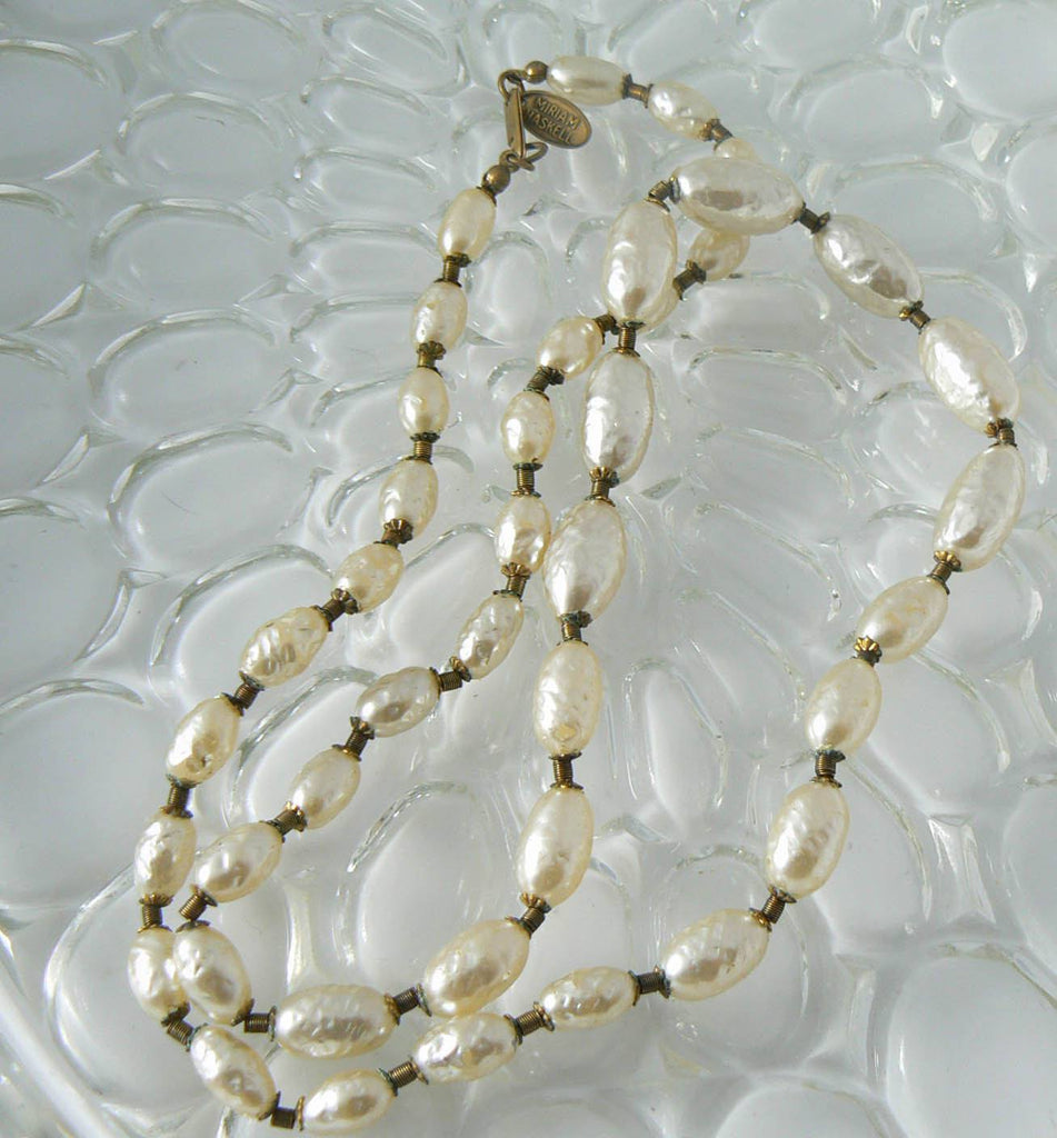 Miriam Haskell Long Oval Baroque Glass Pearl Necklace