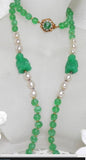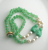 Miriam Haskell Peking Glass & Baroque Pearl Buddha Necklace. Colorful signed Miriam Haskell necklace. It features 1 strand of swirled apple green translucent Peking glass beads that are separated by faceted gold spacer beads. There are 2 stations, one on each side, that have baroque pearl accents and carved Buddha Peking glass beads. The total length is 27" and each station is 3.1/2" with 1" Buddha beads. The beads on the strand are approximately 7mms and the pearls are 9mms. There's a pretty Jade and seed pearl flower wired on to the sliding box clasp as well. Excellent condition.