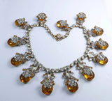 Statement Necklace Czech Glass Large Amber Stones Clear Rhinestones. Set in non-plated brass. This has large open back amber teardrop glass stones. Each stone has clear round cut faceted rhinestones in a flower shape with amber rhinestone accents. All suspended from a 6mm rhinestone chain. The teardrop stones measure 24mm by 18mm. Measures 19" including the 3" extension chain. Secure lobster claw clasp. Very good condition, beautiful necklace.