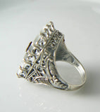 Vintage Ruby, Onyx Camphor Glass Sterling Ring. Open filigree frame Sterling silver stamped 925. Set with a Natural Ruby center stone on genuine onyx. Large ring over 1" tall. Size 9. Camphor glass is circa 1920's, the setting is from the 1980's. New old stock, mint condition.