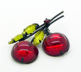 Double Cherry Fruit Figural Austria Pin.Signed Austria. Gorgeous double cherry pin with green carved glass leaves. Foil backed glass stones in a japanned metal setting. Measures 2 1/4" by 1 1/2" Excellent vintage condition.