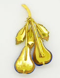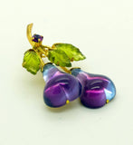 Double Purple Pear Fruit Figural Austria Pin. Unsigned Austria. Gorgeous double pear pin with green carved glass leaves. Foil backed glass stones in a japanned metal setting. Measures 2 1/4" by 1 1/2" Excellent vintage condition.