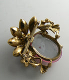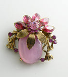 Golden Leaves, Pink Rhinestones and a Pink Glass Cabochon. Large Flower pin