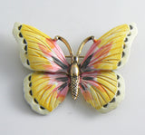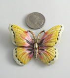Hollycraft Enamel Butterfly Figural Brooch. The colors are yellow, pink, white and black against a rich gold tone. The back is signed Hollycraft and has a good secure safety catch. The butterfly measures 5 5/8" across x 2" tall and is in wonderful vintage condition.