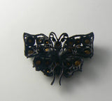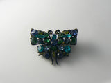 Japanned blue and green rhinestone butterfly brooch. It measures over 2 1/4" wide and over 1 3/4" at the tallest point and stands about 3/8" high. Sparkling foil backed stones, nice quality, heavier piece weighing 26 grams.
