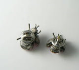 This set is of two vintage signed Regency Jewels rhinestone encrusted bugs. Both have Japanned metal, and prong set pink and aurora borealis rhinestones.The larger insect is signed REGENCY JEWELS in caps. The smaller matching bug is unsigned.The larger measures 1" tall and is 3/4" wide. The smaller bug is 7/8" tall and 3/4" wide. Both are tack-style pins and come with push-on backs.
