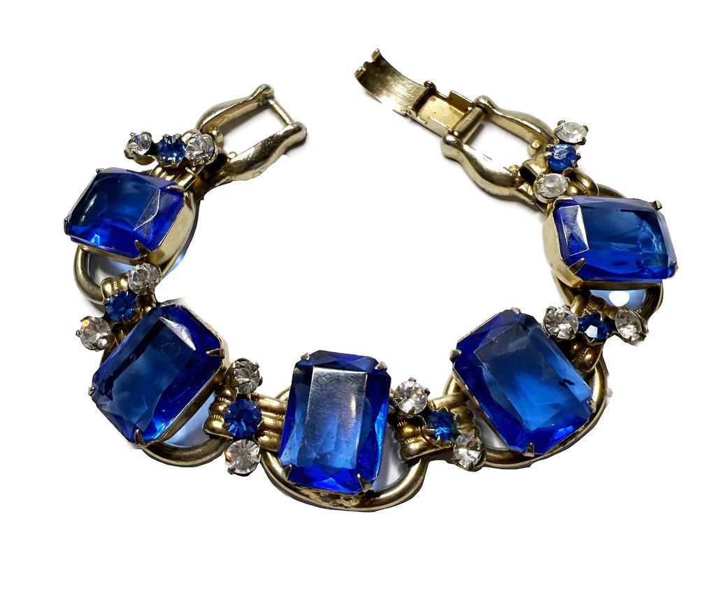 Blue Glass Art Deco Bracelet. Vintage Art Deco Czech bracelet with vivid blue glass stones in a brass filigree setting. Measures just under 7" in length. Excellent condition.